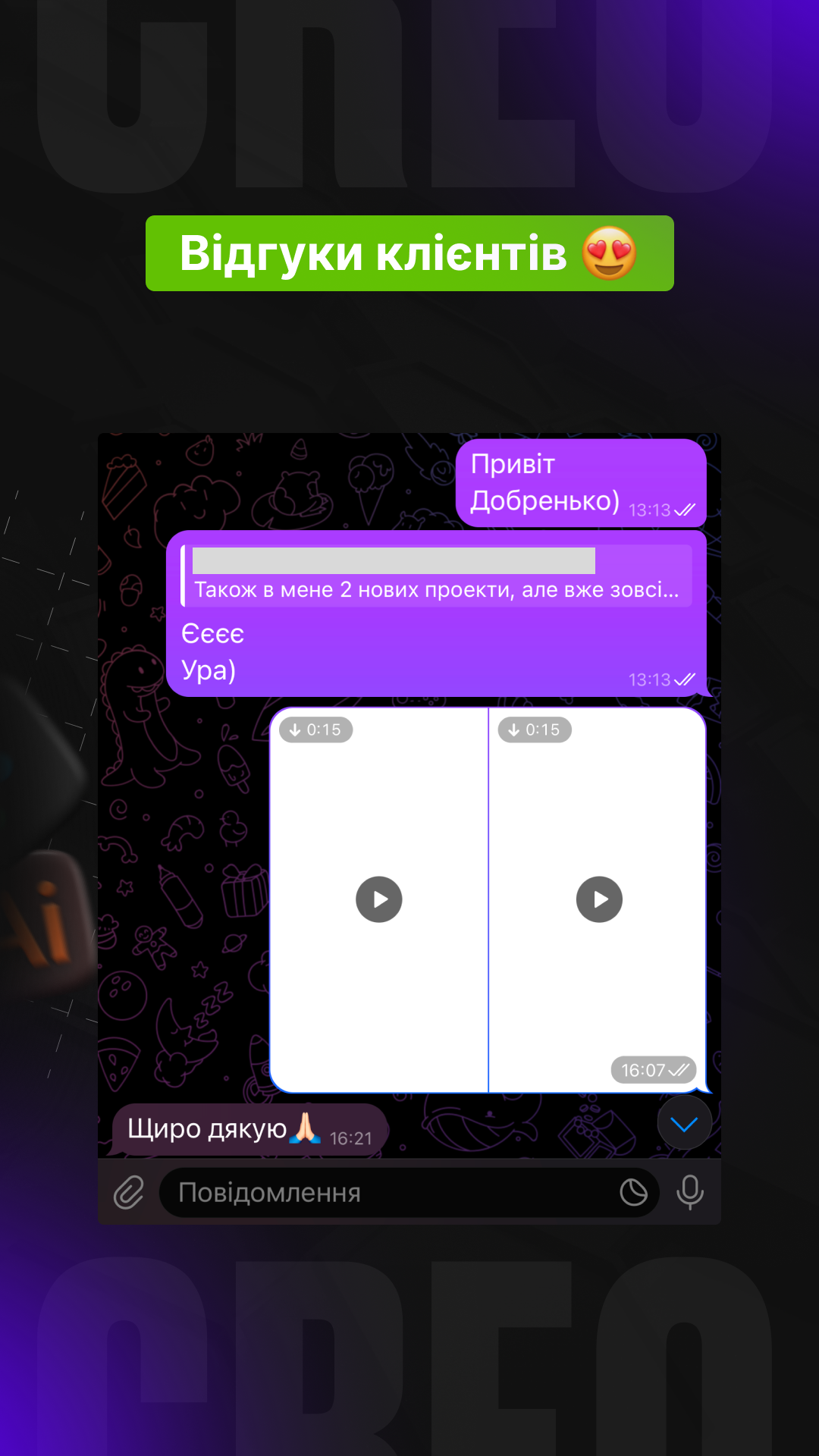 Я всегда подстраиваюсь под дедлайн клиентов — даже если они очень сжатые. Работаю быстро и без вреда для качества.
